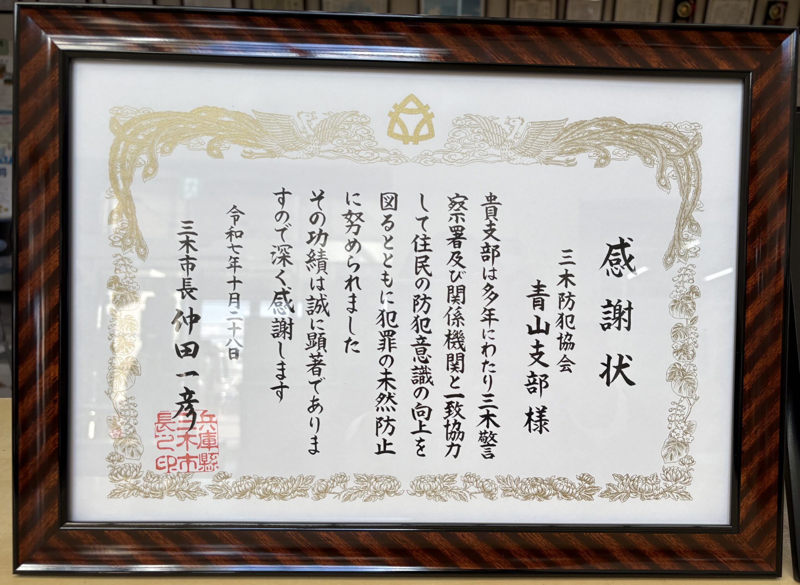 本日、『兵庫県立三木山森林公園音楽ホール』にて“三木の安全なくらしを守る市民大会”が開催されました。 三木防犯協会青山支部は令和3年三木防犯協会、令和4年東播磨地区、令和6年兵庫県警察本部に続き今年度三木市長表彰を受賞しました。 感謝状および盾は青山公民館に展示しています。 Post Views: 10